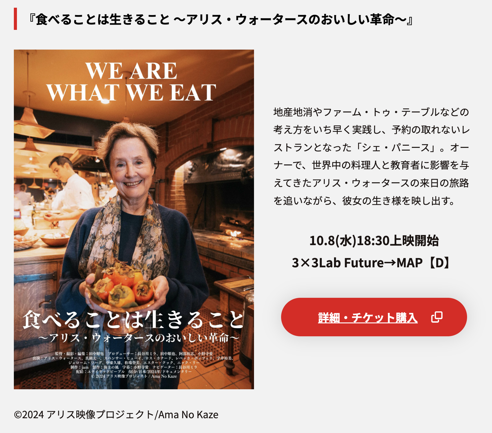 アメリカ・カリフォルニアで地産地消やファーム・トゥ・テーブルなどの考え方をいち早く実践し、予約の取れないレストランとなった「シェ・パニース」。そのオーナーで、世界中の料理人と教育者に影響を与えてきたアリス・ウォータースの2023年の来日の旅路を追いながら、彼女の生き様を映し出したドキュメンタリーです。