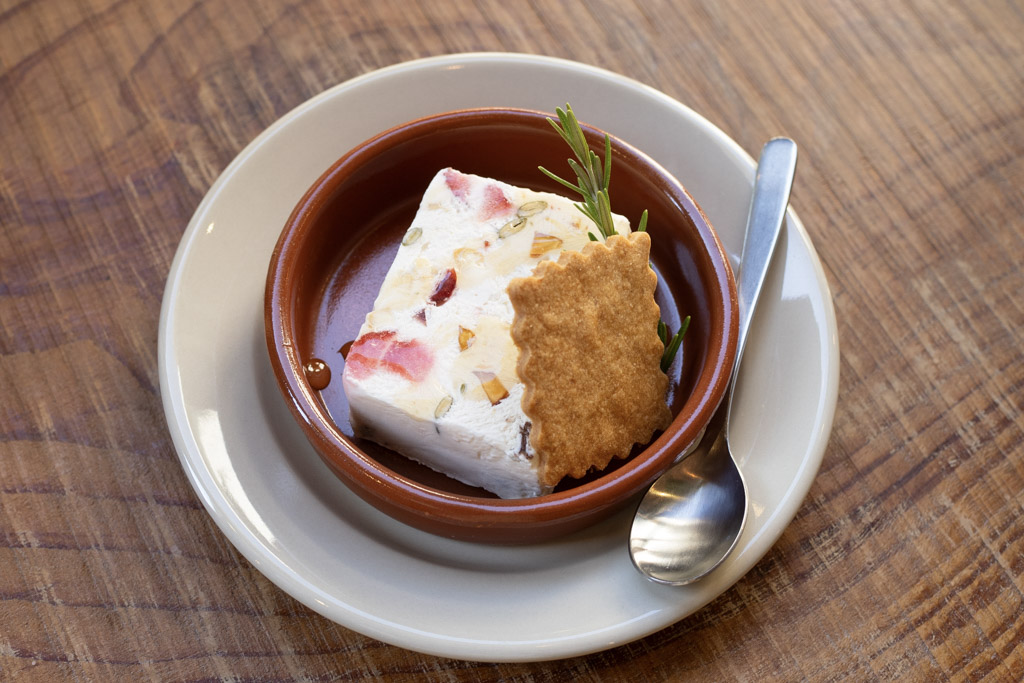 カッサータ (アイスチーズケーキ)イタリアのフローズンスイーツ。チーズクリームの中には小豆島のイチゴや甘夏、アーモンド、カシューナッツなどがたっぷり入っています。カラメルクッキーと一緒に。
